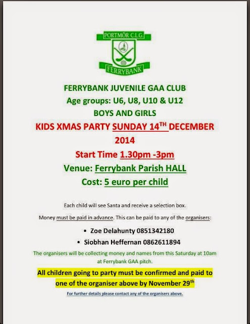 CHRISTMAS PARTY: Its hard to believe thats its the time of the year again, and the Ferrybank Gaa Club will host their Annual Christmas Party for Boys & Girls from the age groups of Under 6,8,10,12 on Sunday December 14th in the Parish hall from 1:30pm-3pm. The cost per child is €5, and each child will see Santa and receive a selection box. All money